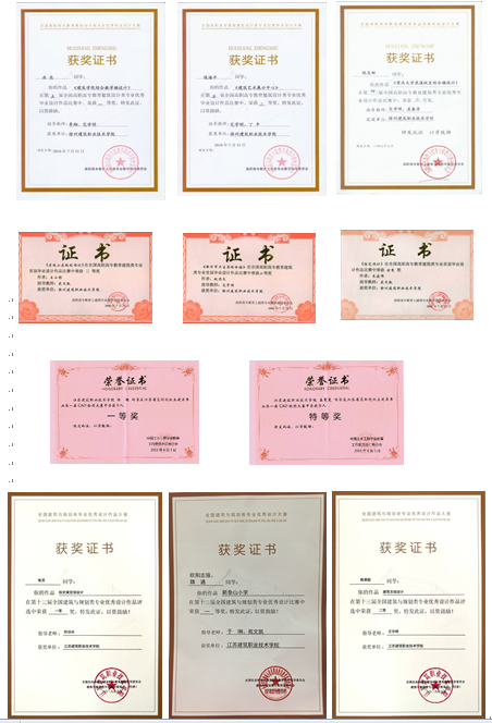 学生经过专业课的学习、训练和企业实习,参加了多项校级、市级、省级的建筑设计大赛,并取得了优异的成绩。